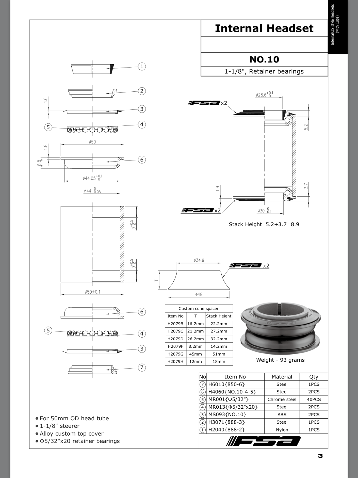 FSA No.10 Semi Integrated / Internal Headset - 1-1/8" 16.2mm Top Cone ZS44 #XTE1635