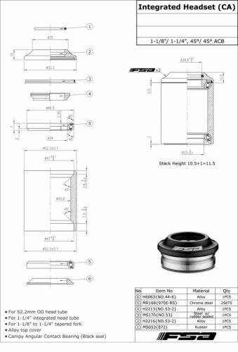 Home > BICYCLE PARTS > Head Sets > FSA No.53-1 1-1/8" - 1-1/4" Integrated Headset With Top Cap #XTE1670